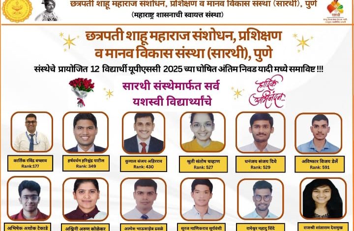 मराठा आरक्षणाच्या संघर्षातून आणि मराठा क्रांती मोर्चाच्या रेट्यातून निर्माण झालेली ‘सारथी’ छत्रपती शाहू महाराज संशोधन, प्रशिक्षण व मानव विकास संस्थाआता खऱ्या अर्थाने मराठा समाजातील गुणवंत मुलांसाठी दिशादर्शक ठरत आहे. केंद्रीय लोकसेवा आयोगाच्या (UPSC) नुकत्याच जाहीर झालेल्या निकालात सारथी संस्थेच्या मार्गदर्शनाखाली तब्बल १२ विद्यार्थ्यांनी घवघवीत यश संपादन केले असून, त्यांच्यावर सर्वस्तरातून अभिनंदनाचा वर्षाव होत आहे.